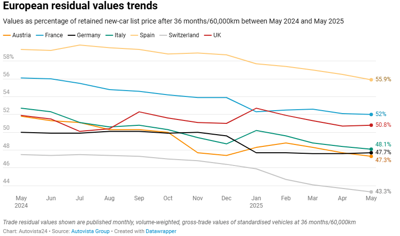 Italy saw the biggest year-on-year decline in %RVs, with values dropping by 4.6 percentage points (pp) compared to May 2024. Austria was next, down 4.3pp, then Switzerland, dropping 4.2pp.