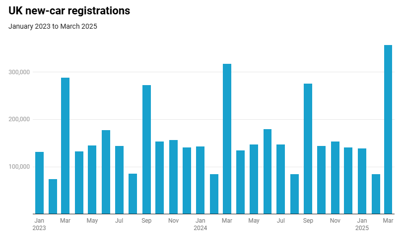 The latest data from the SMMT reveals that UK new-car registrations grew 12.4% in March. A total of 357,103 units were delivered to customers, up by 39,317 deliveries year on year. This is the best March total since 2019 and brings an end to a run of declines stretching back to October 2024.